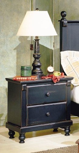 Black sand through Cottage collection makes for a great retreat look. This old-world charm collection is styled and priced for today?s buyer. Features: Black Sand Through Finish Matching pull knobs Two drawers for storage Homey classic style Solid Wood Construction Specifications: Dimensions: 27" H x 16" D x 26" W Weight: 57