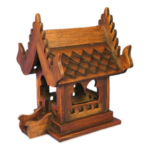 Import an air of Eastern spirituality and fine craftsmanship with this handmade teak wood spirit house. This intricately carved piece is expertly handcrafted by artisans in the village of Baan Thawai in northern Thailand. When Thai people build new homes or inhabit new places, they erect a small spirit house, similar in design to this one, as a place for the local spirits and energy to reside. It is believed that it will bring luck, happiness, accomplishment and security for all members of the household for many years to come. Bring the "spirit" of this spirit and its beautiful handcrafted detail to your house. Measures 8 inches high x 6 inches wide x 6 inches long. AsiaEXP brings you handicrafts of exceptional quality from a variety of Eastern cultures, while simultaneously supporting talented Asian craftsmen and their creative traditions. By purchasing this product you are not only acquiring a beautiful handmade creation, but also helping to sustain the local artisans and cultural heritage of Asia. The handcrafted nature of this item will produce minor differences in design, color and sizing. Subtle variations will occur from piece to piece, adding to the unique quality of individual creations. Measurements may vary slightly.